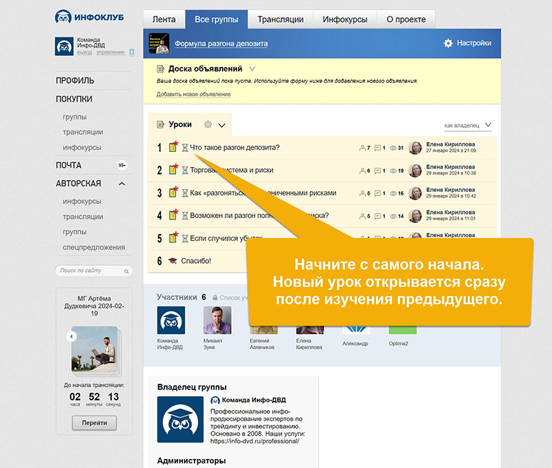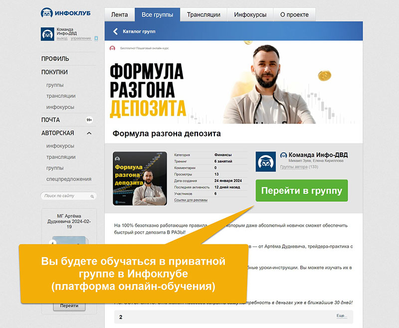 Помимо помощи от автора курса в закрытой группе в Инфоклубе, Вы (при необходимости) получите персональные консультации от специалистов Службы Заботы Инфо-ДВД. В том числе и по телефону!